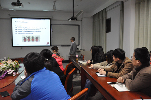 报告开始,主持人王笑老师对Fulai Liu副教授的到来表达了热烈的欢迎,紧接着对他的工作和科研做了简单的介绍。Fulai Liu 副教授于2000年获德国汉诺威大学园艺科学系农学硕士,2004年获得丹麦皇家兽医农业大学农学博士。1996-1998年在中国农业科DB彩票 土壤与肥料研究所担任助理研究员,2000-2001年在德国汉诺威大学园艺科学系担任研究助理。2004年起在丹麦哥本哈根大学任助理教授、副教授。Fulai Liu 主要在作物逆境生理及特别在干旱胁迫诱导的根源化学信号对作物营养与生殖发育的调控、作物响应气候变化等领域开展研究、碳水化合物代谢及水分利用效率的影响等方面进行了系统的研究。Fulai Liu 作为主要研究人员主持或参加欧盟合作项目、丹麦科学研究基金会项目十余项,是丹麦哥本哈根大学博士学位委员会主席、吉林大学兼职教授、DB彩票 客座教授、中科院东北农林研究院兼职研究员。Fulai Liu博士还是中丹联合大学(丹麦政府与中国科DB彩票 合作办学,以联合培养两国研究生为主)的协调人和主要负责人。