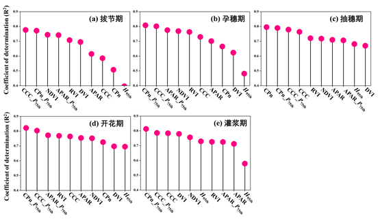 进一步基于小麦光合参数三维空间分布,筛选并新建兼具结构和生理信息的三维光合新指标CPn_P75th和CCC_P75th,这些指标相比于传统遥感指标和农学性状对作物产量表型具有更好的指示能力(图3)。