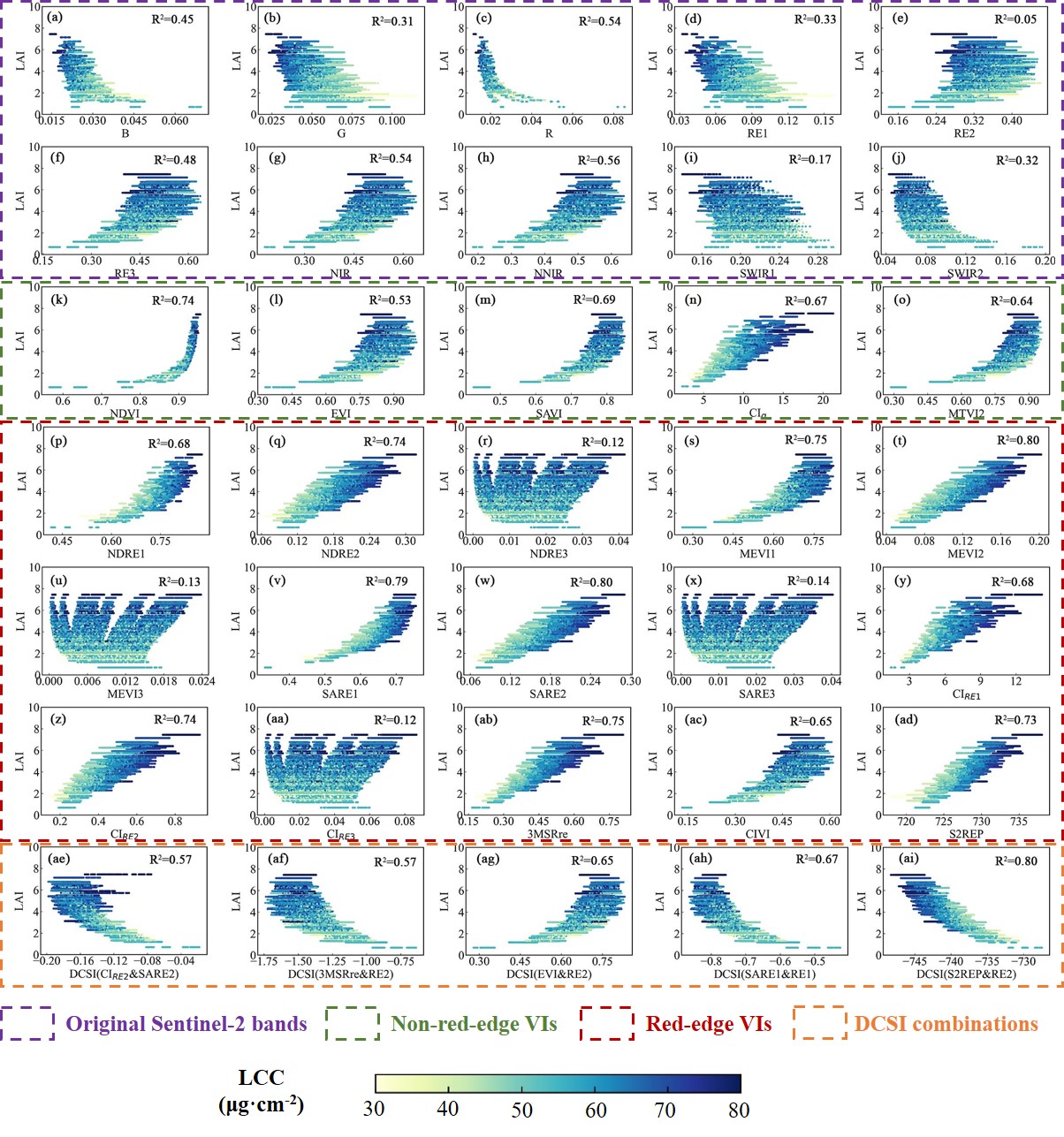 图1. 不同植被指数对LCC变化的响应。水平方向的颜色变化可以表示VI-LAI关系对LCC变化的响应