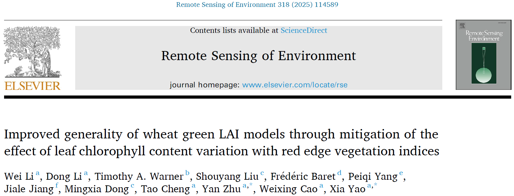 《Remote Sensing of Environment》发表智慧农业团队“Improved generality of wheat green LAI models through mitigation of the effect of leaf chlorophyll content variation with red edge vegetation indices”