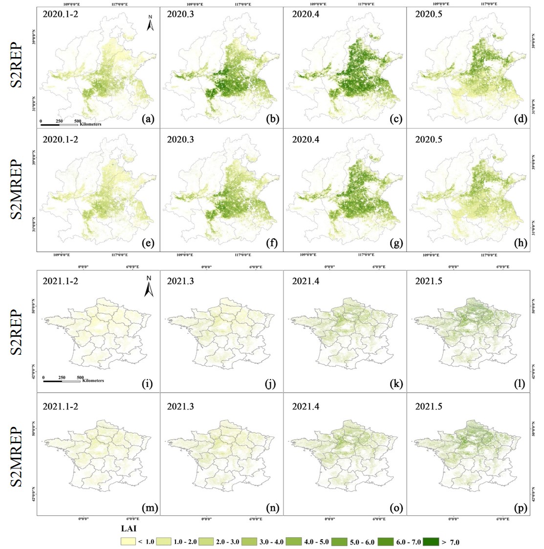 图2. 2019-2020年中国(a-h)与2020-2021法国(i-p)小麦主产区作物LAI的季节演变