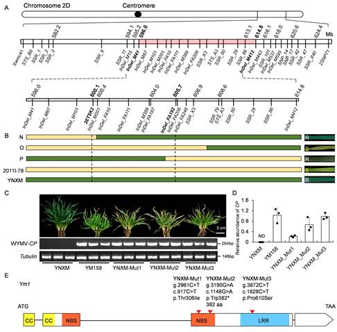 20世纪60年代,由小麦黄花叶病毒(Wheat yellow mosaic virus, WYMV)引起的小麦黄花叶病毒病在我国四川首次报道,90年代在江苏苏中等地区重发,最初命名为小麦梭条花叶病,后更名为小麦黄花叶病。WYMV通过土壤中禾谷多黏菌(Polymyxa graminis, Pg)作为介体侵染和传播,因此培育和利用抗病品种是最有效和根本的防控措施。不同研究团队在2DL、3BS、5AL、6DS等染色体上定位了抗性位点,其中位于2D上的基因被多个研究团队反复报道,分别命名为QYm.nau-2D(本研究团队)、YmYF、YmIb和Q.Ymym等,但该基因尚未克隆,其介导的抗性遗传机理也不清楚。