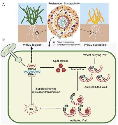 进一步研究发现,Ym1通过识别并与WYMV外壳蛋白(CP)互作触发免疫反应:其LRR结构域与CP互作,CC结构域引发细胞坏死。亚细胞定位表明,Ym1在细胞核和细胞质中均有分布,Ym1-CP互作后,Ym1发生核-质重定位(从细胞核转移至细胞质),将其从抑制状态变为激活状态,引发过敏反应,从而赋予根部特异表达的Ym1抵御病毒向根的中柱鞘侵入的能力,阻止病毒进入地上茎叶部位。值得注意的是,Ym1仅抑制病毒侵染,不影响Pg在根部的定殖。