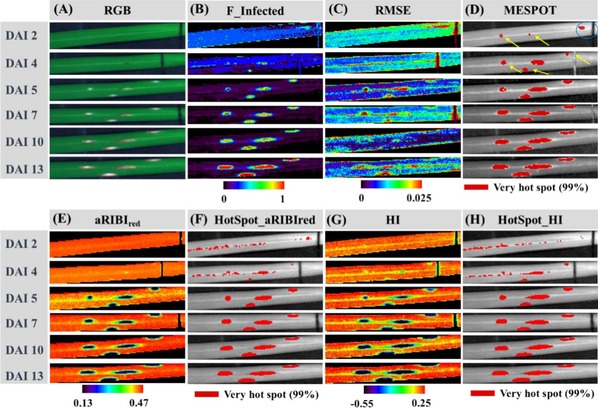 图2.不同接种后天数(DAI)下,基于MESPOT及其他稻瘟病敏感参数(aRIBIred, HI)提取的病斑空间分布图