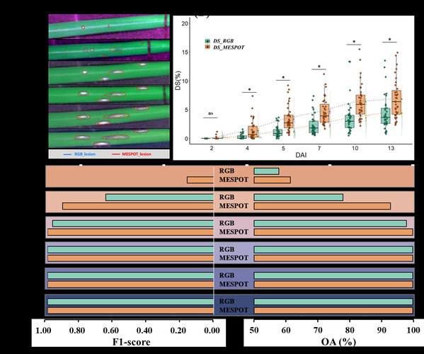 图3.基于RGB图像人工识别与MESPOT方法在量化无症状期稻瘟病症状中的比较