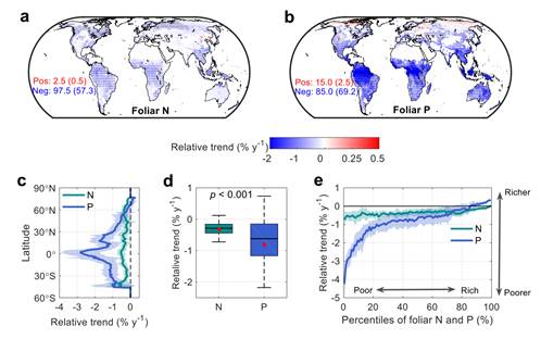 研究团队收集了超过8万条叶片氮、磷含量的野外观测数据,并结合机器学习方法,生成了1980年至2017年的全球长期数据集。结果显示,叶片磷含量下降的速率(每年约−0.80%)明显高于氮含量的下降速率(每年约−0.31%)。这一趋势导致全球越来越多的地区出现磷限制,尤其在热带和中纬度地区表现突出。相比之下,氮限制区域的变化相对平稳。这种不均衡的变化意味着植物的生长发育在全球范围内正面临更强烈的磷短缺压力。
