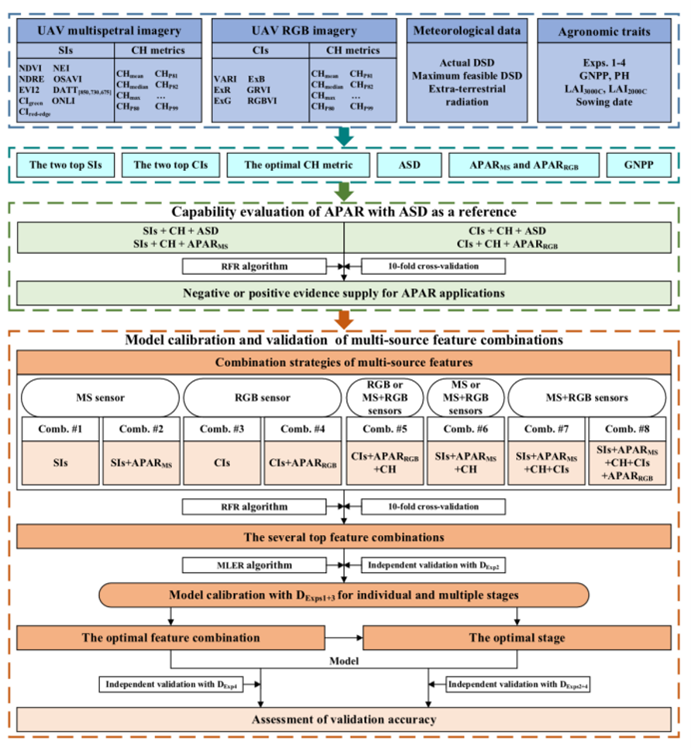 气象特征: 计算累积日照时数 (ASD) 和 吸收光合有效辐射 (APAR)。使用随机森林 (RFR) 进行特征评估,并采用元学习集成回归 (MLER) 进行最终的预测建模。