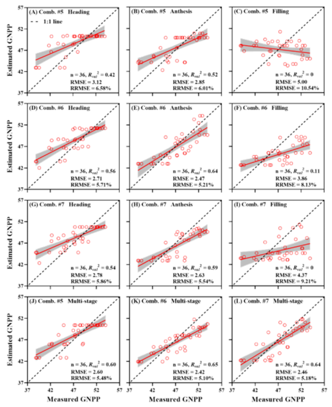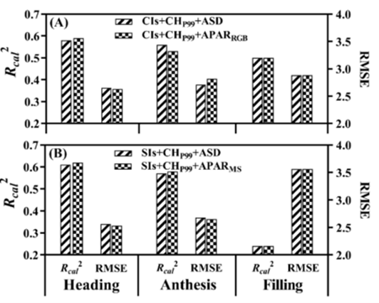 研究对比了简单的累积日照时数 (ASD) 和经过冠层校正的吸收光合有效辐射 (APAR)。在大多数阶段,引入APAR (特别是基于多光谱反演的 ) 的模型精度优于ASD。这是因为ASD仅仅是时间的累积,无法区分作物生长状态;而APAR结合了LAI信息,更能反映作物实际利用光能进行光合作用的能力,从而更准确地指示穗粒数的形成。
