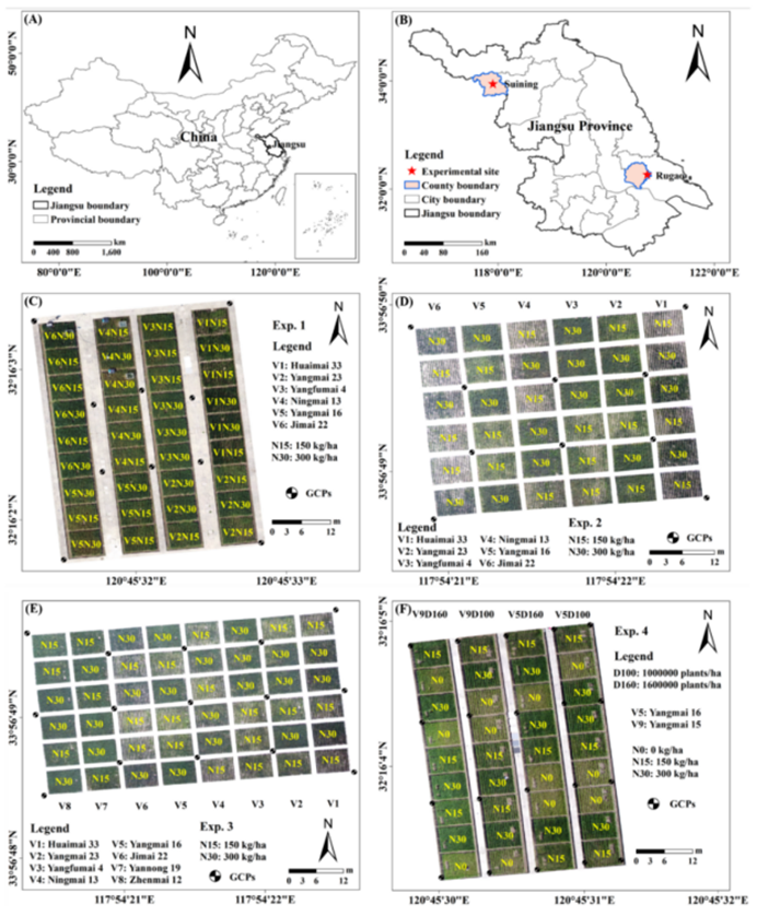 为了保证模型的普适性,研究设计了跨越不同年份、地点和品种的综合实验。实验地点: 实验在中国江苏省的两个主要小麦产区——如皋 (Rugao) 和睢宁 (Suining) 进行,涵盖了不同的气候条件。