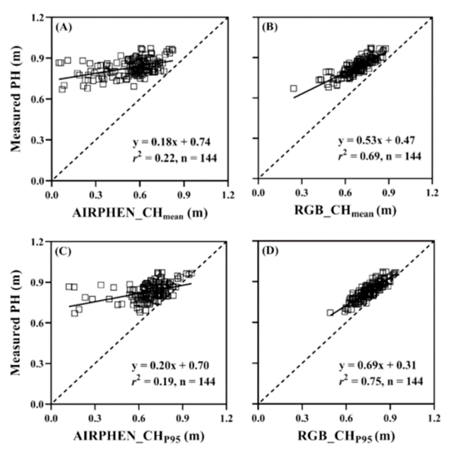 为了准确捕捉作物结构,研究对比了AIRPHEN多光谱相机和RGB相机生成的点云,以及不同的高度分位数。AIRPHEN多光谱影像提取的株高与实测值的相关性较差 ( R2约 0.2),而RGB影像提取的株高精度显著更高 ( 约 0.7)。这是由于RGB相机具有更高的空间分辨率,能构建更精细的点云。