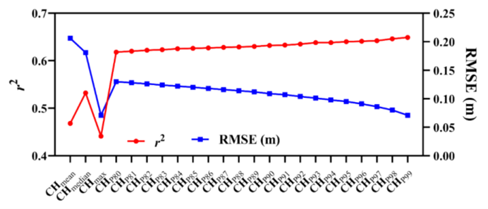 进一步地,为了确定哪个统计量最能代表群体株高,作者分析了不同分位数的RGB-CH指标。结果显示,随着分位数的增加,相关性逐渐提升。其中,99%分位数与实测株高的相关性最强,RMSE最低。因此, CHp99被选为最佳结构特征。
