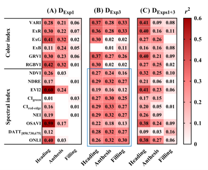 光谱特征是反映作物生长状况的直接指标。热图展示了各类指数与穗粒数GNPP在不同生长阶段的相关性。结果表明,EVI2 和 OSAVI (多光谱指数) 以及 ExR 和 GRVI (RGB指数) 与GNPP的相关性最强且在不同生长阶段较为稳定。