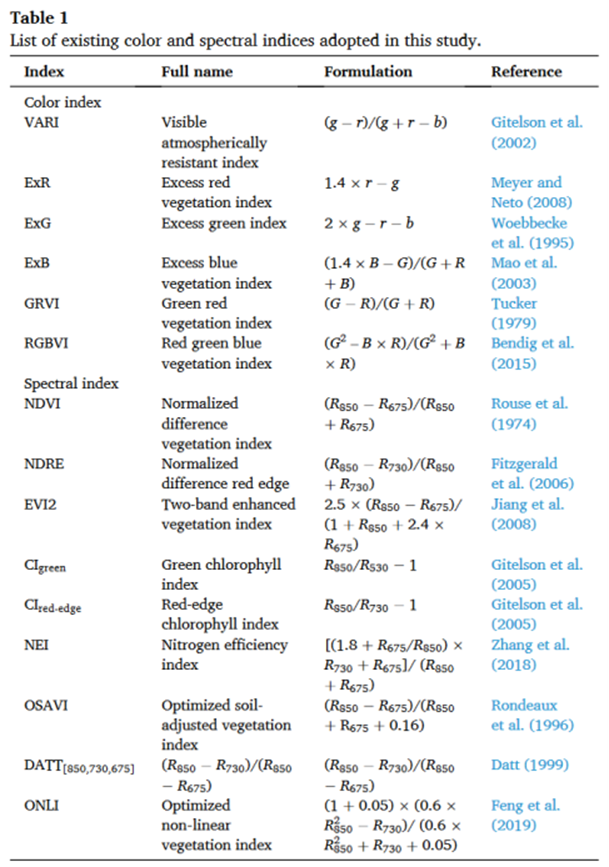 光谱特征: 从UAV影像提取植被指数 (SIs, 如NDVI, EVI2) 和颜色指数 (CIs)。