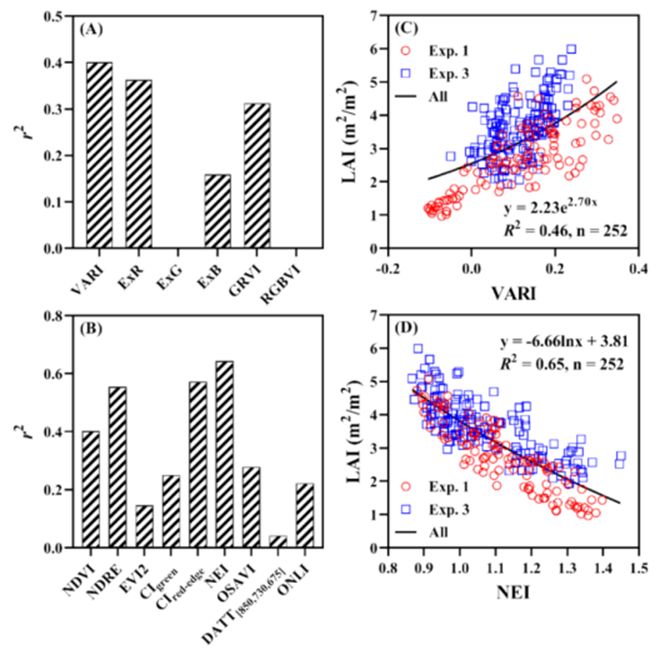 在计算APAR之前,必须先准确反演LAI。研究对比了LAI与各类指数的关系。结果表明,NEI 指数与LAI的相关性最高(r2 = 0.64),且呈现对数关系。因此,研究选择使用NEI模型来反演LAI,进而计算APAR。