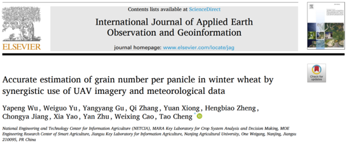 《International Journal of Applied Earth Observation and Geoinformation》发表智慧农业创新团队“Accurate estimation of grain number per panicle in winter wheat by synergistic use of UAV imagery and meteorological data “