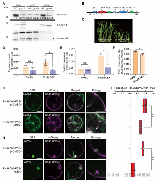 GPA5是已报道的Rab5a效应子,通过N端PX结构域结合PI3P,调控DV与PBII的融合过程。为解析PI3P的下游调控机制,研究通过细胞组分分离实验发现:野生型中GPA5主要定位于膜组分(P100),而gpa14突变体中膜结合型GPA5的含量显著降低,更多分布于细胞质组分(S100)。利用PI3K抑制剂LY294002处理Rab5a-GFP转基因株系,同样发现Rab5a和GPA5的膜结合比例显著下降。 进一步构建地塞米松(DEX)诱导的OsVPS34 RNAi株系,DEX处理后OsVPS34表达量显著下调,PI3P含量降低,此时Rab5a和GPA5与PVC标记Rha1的共定位程度较对照组下降40%以上,证实PI3P是维持二者膜定位、保障其功能的关键信号。