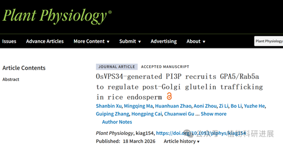 《Plant Physiology》在线发表万建民院士团队“OsVPS34-generated PI3P recruits GPA5/Rab5a to regulate post-Golgi glutelin trafficking in rice endosperm”