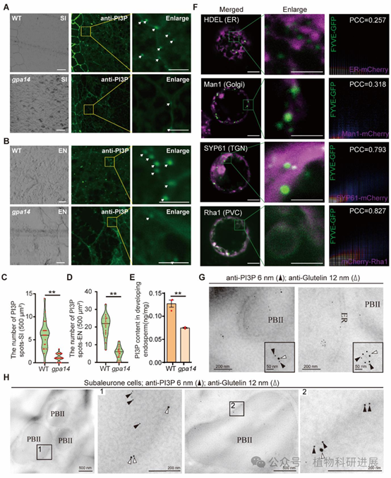 为解析OsVPS34的作用机制,研究通过免疫共沉淀联合质谱(IP-MS)鉴定到OsVPS34的互作蛋白包括PI3K复合体的核心亚基OsVPS15、OsATG6b、OsVPS38和OsATG14,说明水稻中存在保守的两类PI3K复合体:调控自噬的PI3K复合体I(含ATG14)和调控囊泡转运的PI3K复合体II(含VPS38)。进一步通过酵母双杂交、荧光素酶互补(LCI)、Co-IP、双分子荧光互补(BiFC)实验证实,OsVPS34与OsATG6b存在最强的直接互作,且OsVPS34-OsATG6b复合体共定位于反式高尔基体网络(TGN)和前液泡区室(PVC),与谷蛋白转运的关键细胞器定位一致。 PI3K复合体的核心功能是催化合成磷脂酰肌醇3-磷酸(PI3P),检测显示gpa14发育胚乳中PI3P的含量较野生型降低60%以上,免疫荧光标记显示突变体中PI3P的点状信号数量仅为野生型的20%。利用PI3P特异性报告系统FYVE-GFP的共定位分析显示,PI3P主要富集于TGN和PVC,皮尔逊相关系数分别达0.793和0.827;免疫金标记进一步证实PI3P与谷蛋白共定位于致密囊泡(DV)和PBII中,直接证明PI3P参与谷蛋白的转运过程。