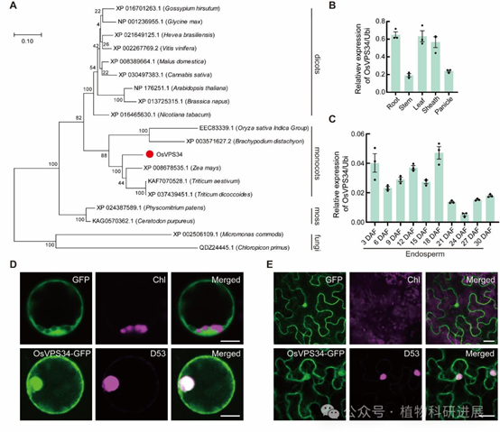 图5 OsVPS34的进化、表达模式与亚细胞定位