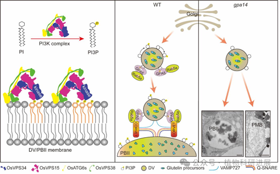 基于上述结果,研究提出了完整的调控模型:野生型水稻胚乳中,OsVPS34作为PI3K复合体的核心催化亚基,在TGN出芽形成的致密囊泡(DV)和PBII膜上催化合成PI3P;PI3P作为膜信号分子,招募效应子GPA5和小G蛋白Rab5a到膜上,后续GPA5通过与CORVET栓系复合体、SNARE融合复合体互作,介导DV与PBII的膜融合,将谷蛋白前体转运至PBII中完成切割和沉积;而gpa14突变体中OsVPS34功能缺失,PI3P合成受阻,GPA5和Rab5a无法正确定位到膜系统,导致DV不能正常转运至PBII,未被转运的谷蛋白被错误分泌到胞外形成PMB结构,最终表现为谷蛋白前体积累、胚乳粉质皱缩的表型。