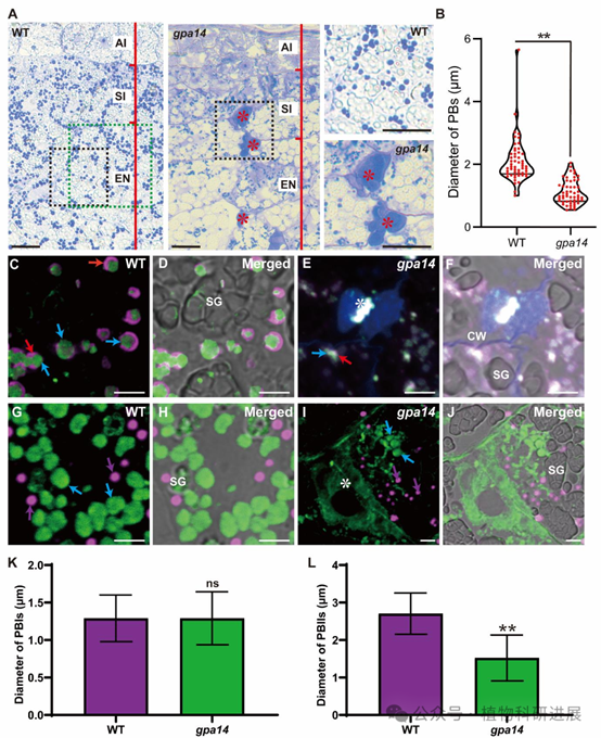 研究从组织培养诱变的粳稻品种宁粳4号突变体库中筛选获得谷蛋白前体积累突变体gpa14,其成熟种子表现为粉质皱缩表型,扫描电镜显示突变体胚乳淀粉颗粒呈球形、排列松散。SDS-PAGE和免疫印迹分析显示,gpa14中57 kDa谷蛋白前体大量积累,而成熟谷蛋白酸性/碱性亚基、26 kDa α-球蛋白、醇溶蛋白的含量均显著降低。内质网分子伴侣BiP1和PDI1-1的含量在突变体与野生型中无显著差异,说明谷蛋白前体积累并非内质网输出缺陷导致,而是高尔基体后的转运过程出现异常。 细胞学观察证实了转运缺陷:12 DAF(授粉后天数)胚乳的免疫荧光标记显示,野生型中谷蛋白和α-球蛋白共同定位于PBII中,而gpa14中部分谷蛋白和α-球蛋白被错误分选到胞外形成副壁体(PMB)结构,PBII的体积显著小于野生型,仅储存醇溶蛋白的PBI结构未受影响。透射电镜观察进一步发现,gpa14中高尔基体出芽形成的致密囊泡(DV)无法正常转运至PBII,大量堆积在细胞膜附近并被分泌到胞外,形成电子致密的PMB结构。