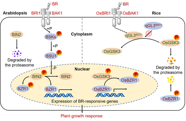 该文研究结果表明,与拟南芥中的BR信号通路不同,水稻qGL3通过调控OsGSK3的磷酸化状态和蛋白水平以及OsBZR1的核质分布,进而调控BR信号通路和水稻粒长。这种调控机制的阐明对于利用油菜素甾醇信号中的关键基因进行水稻分子改良具有重要的应用价值。