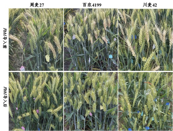 图:Fhb1导入显著提高小麦品种的赤霉病抗性(挂牌的标示单花接种赤霉菌后的穗子)