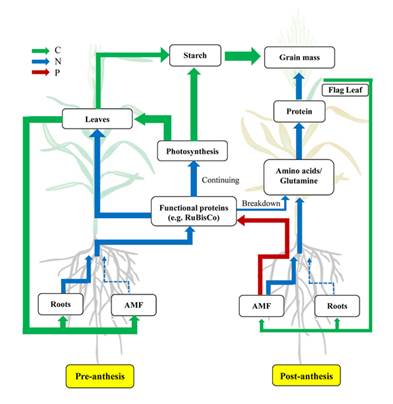 近日,DB彩票 耕作制度与农田生态课题组的最新研究成果“Temporal complementarity be tween roots and mycorrhizal fungi drives wheat nitrogen use efficiency”在New Phytologist上发表。该成果揭示了氮高效小麦品种在花前依赖根系吸收氮素而花后依赖丛枝菌根真菌(AMF)促进花前吸收氮素转化形成籽粒产量的生育期互补机制。