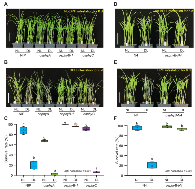 该研究首先分析了不同光照强度对水稻褐飞虱抗性的影响,结果发现光照强度正调控水稻褐飞虱抗性。进一步实验证明无论是抗虫品种还是感虫品种,相对于正常光照(Normal light, NL),弱光照(Dim-light, DL)显著降低野生型的褐飞虱抗性,而光敏色素OsPHYB的突变体在弱光下褐飞虱抗性并未降低(图1),说明弱光降低水稻褐飞虱抗性依赖于OsPHYB