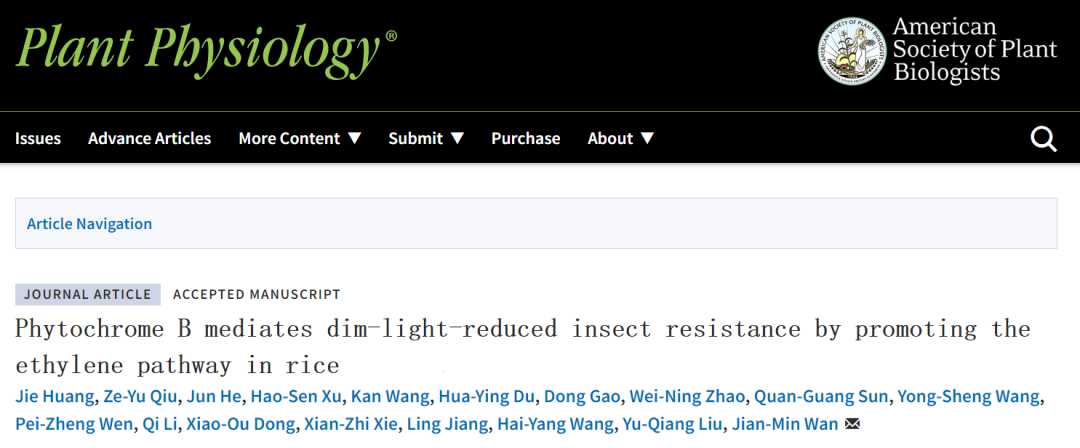 《Plant Physiology》发表万建民院士团队“Phytochrome B mediates dim-light-reduced insect resistance by promoting the ethylene pathway in rice”
