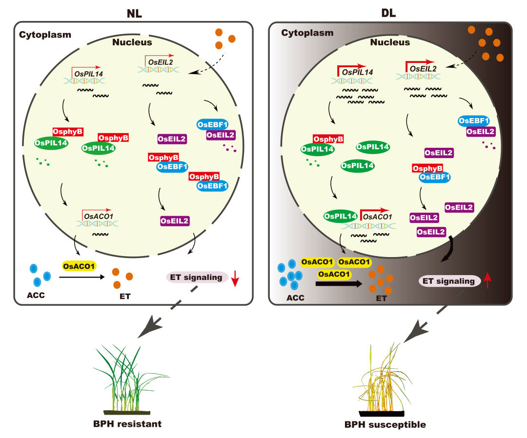 进一步研究发现,光照促进水稻细胞核内活性态OsphyB蛋白积累,加速光敏色素互作因子(Phytochrome-Interacting Factors)OsPIL14蛋白降解,而转录因子OsPIL14可结合乙烯合酶OsACO1的启动子并促进其表达。因此,光照抑制乙烯生物合成,同时抑制乙烯信号途径基因OsEIL2表达,导致OsEIL2蛋白量呈组成型减少,实验证明OsEIL2及乙烯途径负调控水稻褐飞虱抗性;作者进一步研究发现,与之前在其他物种中报道的phyB抑制乙烯信号不同,水稻OsphyB与E3泛素连接酶OsEBF1互作,阻止OsEBF1对OsEIL2的降解作用,且OsPHYB突变体对乙烯不敏感,表明OsphyB抑制乙烯合成而稳定乙烯信号,在乙烯途径中起双重作用。综上,该研究不仅发现了OsphyB调控乙烯途径的新机制,且解析了光照影响水稻褐飞虱抗性的分子机制,加深了对水稻、褐飞虱以及环境之间互作的认识,为褐飞虱的可持续防治提供了理论基础(图2)。