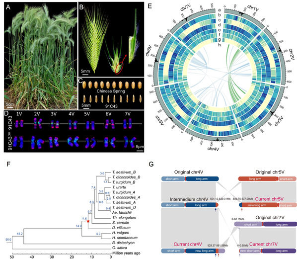 图1 簇毛麦植株、穗型、籽粒、染色体核型和91C43DH基因组
