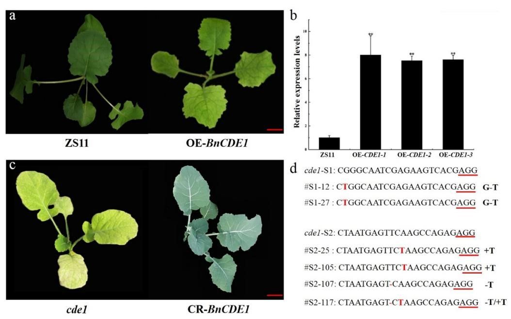 含有BnCDE1I320T基因的突变体叶绿体数量减少,光合效率下降。遗传转化和生理实验证明,由于单碱基突变,通过反馈调节机制,改变了叶绿素和血红素合成途径通量,从而导致叶片黄化和血红素b含量上升。