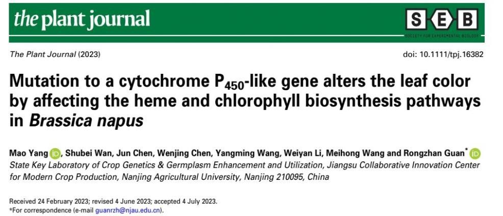 《The Plant Journal》发表油菜遗传育种团队“Mutation to a cytochrome P450-like gene alters the leaf color by affecting the heme and chlorophyll biosynthesis pathways in Brassica napus”