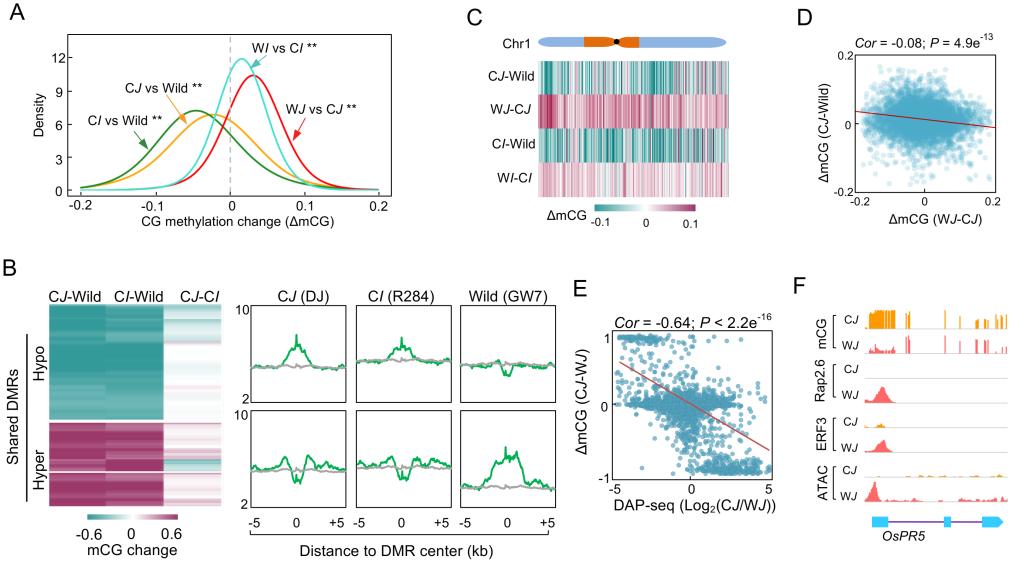 水稻是全球最为重要的粮食作物之一,在其漫长的驯化过程中形成了形态各异的水稻栽培亚型,包括粳稻、籼稻、Aro和Aus等。在水稻栽培种植历史过程中,有些水稻逐渐恢复部分野生稻表型特征,最终演化成严重威胁全球水稻产量的杂草稻,这种现象称之为“去驯化”。通过基因组进化研究发现,大量驯化位点的变异在去驯化过程中并不能得到恢复,这就暗示着可能存在别的遗传机制来调控杂草稻在去驯化过程中恢复野生稻表型。DNA甲基化是一种真核生物保守的表观遗传修饰,对植物的生长发育和环境应答具有重要的调控作用。然而,表观遗传在作物驯化及去驯化过程中的作用并不清楚。