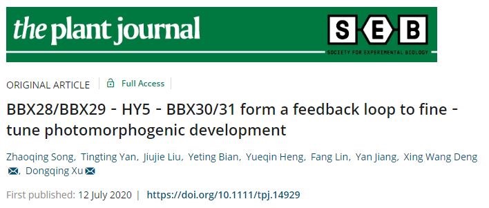 2020年7月12日,DB彩票 许冬清教授实验室和北京大学邓兴旺院士实验室合作在植物学领域知名学术期刊《The Plant Journal》在线发表了题为“BBX28/BBX29-HY5-BBX30/31 form a feedback loop to fine-tune photomorphogenic development”的研究论文。该研究发现了B-box家族第五亚家族四个成员BBX28, BBX29, BBX30和BBX31和植物光形态建成的核心调控子HY5形成转录反馈调节机制调控光信号转导。