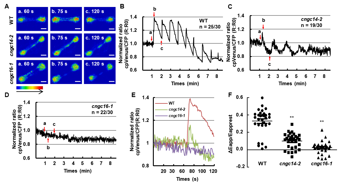 cngc14和cngc16突变体的保卫细胞中热诱导的胞质Ca2+变化