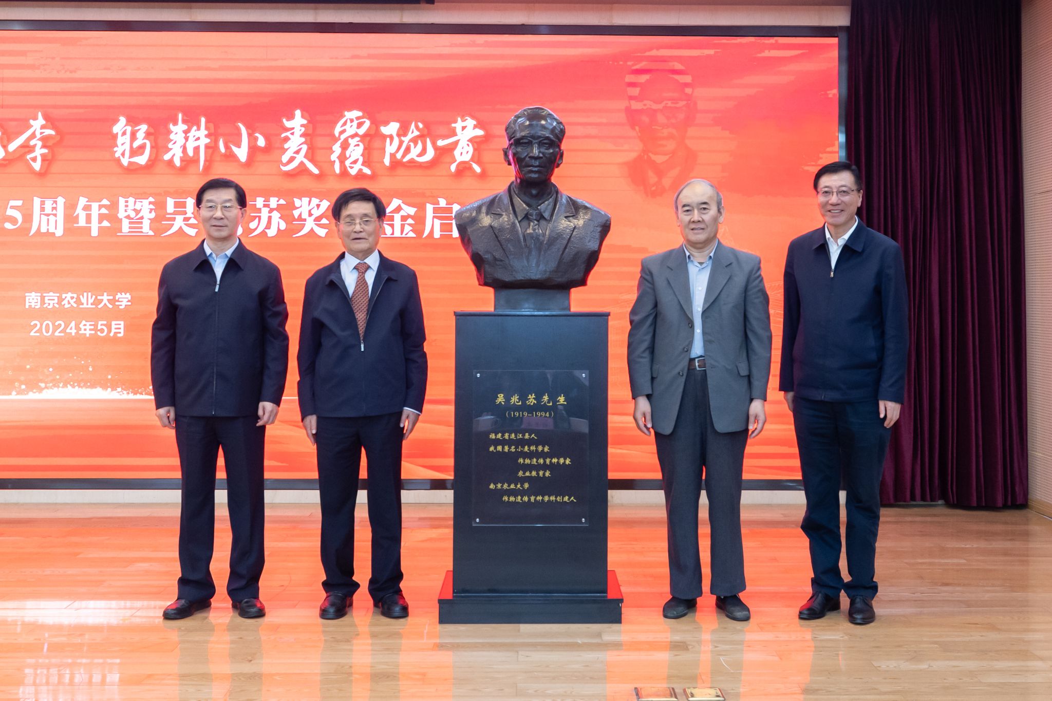 灌浆期的冬小麦正翻滚着绿油油的麦浪,大地即将变成一片金黄,预示着又是一个成熟的夏收。5月12日,为深切缅怀著名小麦科学家、作物遗传育种学家、农业教育家吴兆苏先生,传承弘扬吴兆苏先生“潜心科教、忠诚奉献、辛勤耕耘、正直坦荡”的品质,DB彩票 举行吴兆苏先生诞辰105周年暨吴兆苏奖学金启动仪式。中国工程院院士、DB彩票 教授盖钧镒,江苏省人大常委会原副主任俞敬忠,中国工程院院士、中国农科院研究员刘旭,中国工程院院士、中国农业大DB彩票 长孙其信,中国工程院院士、山东省农科院研究员赵振东,中国工程院院士、中国农科院研究员、DB彩票 教授万建民,中国工程院院士、河南农科院研究员、吴兆苏先生弟子许为钢,全国政协教科卫体委员会副主任、自然资源部原副部长、江苏省原副省长、DB彩票 教授曹卫星,江苏省政协原副主席、南京大学原党委书记胡金波,福建省政协原副主席、省残联第七届主席团名誉副主席、福建农林大学教授、吴兆苏先生弟子陈绍军,第十四届全国政协常委、甘肃省政协副主席、吴兆苏先生弟子尚勋武,安徽省政协副主席、安徽农业大学教授、吴兆苏先生弟子马传喜,江苏省农业农村厅一级巡视员、吴兆苏先生弟子唐明珍,DB彩票 党委书记王春春、DB彩票 校长陈发棣,校党委常委、副校长董维春、单正丰、朱艳,原副校长王耀南等领导专家出席活动仪式,吴兆苏先生海内外弟子,来自中国农业大学、西北农林科技大学、华中农业大学、山东农业大学、河南农业大学、安徽农业大学、山西农业大学、扬州大学、河南科技DB彩票 ,中国科DB彩票 、中国农科院,江苏、山东、河南、四川、浙江、安徽、河北、湖北、黑龙江、云南、新疆、贵州等省市农林科研院所,中农发、中种等18家种业、粮农、机械有限公司的业内同行、专家领导与企业的负责人,DB彩票 相关职能部门负责人,DB彩票 党政班子全体成员,小麦遗传育种团队教师、学生和退休教师代表200多人参加活动。活动由董维春主持,期间,俞敬忠、刘旭、孙其信、曹卫星共同为吴兆苏先生铜像揭幕,全体参会成员行鞠躬礼。