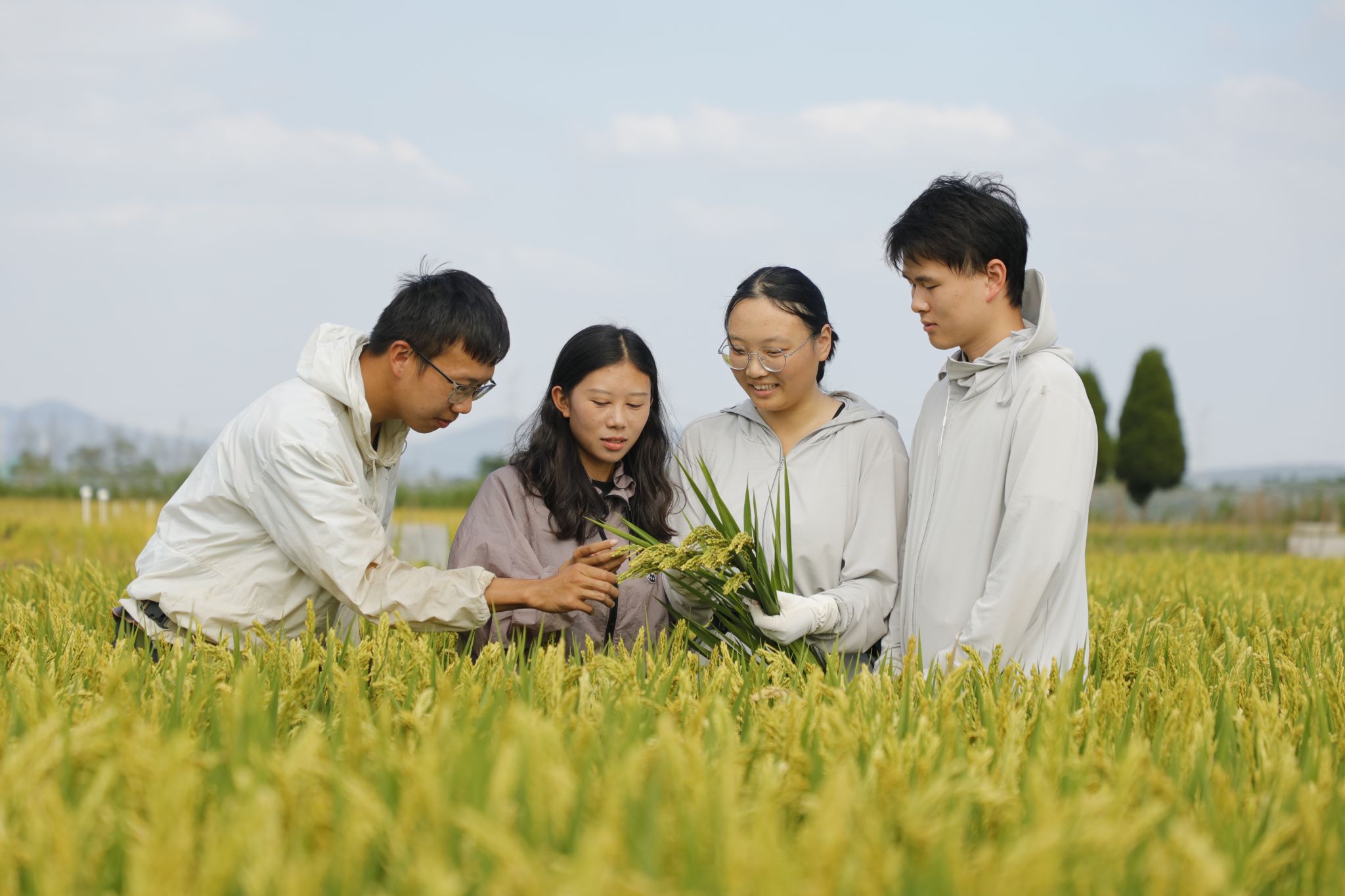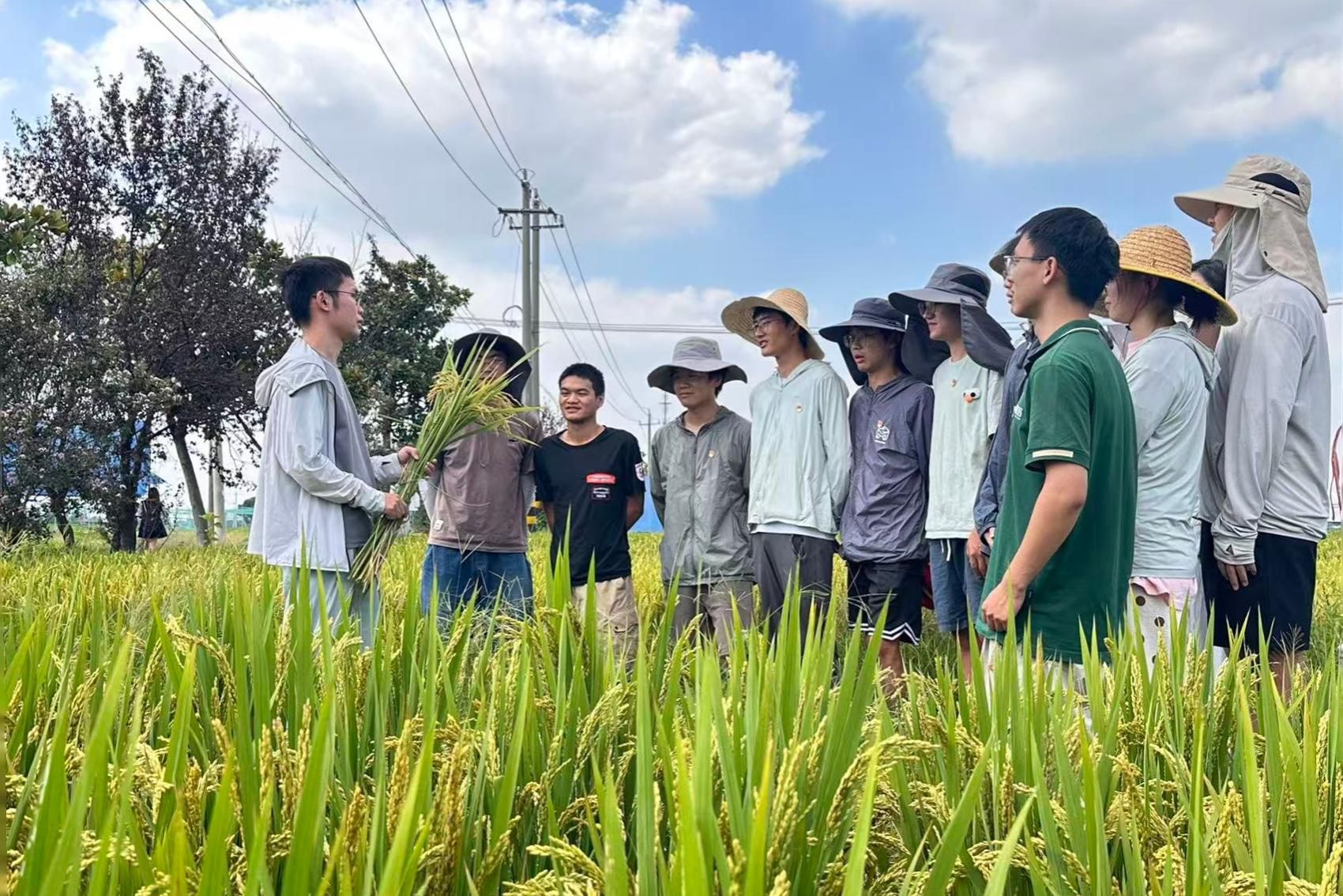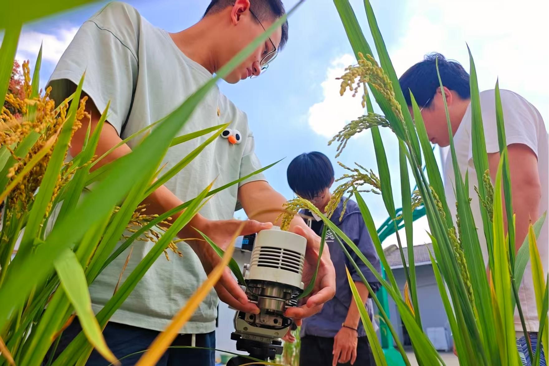 在丹阳试验基地,水稻栽培专业博士研究生石希安在田垄边集合好同学们,讲述了一天的试验目标、任务与分工,准备完成目前水稻灌浆关键期的光合速率指标测量,取土壤样品、水稻籽粒与叶片等,为水稻产量品质协同提升把好“方向”,期待不久后的优质水稻丰产。