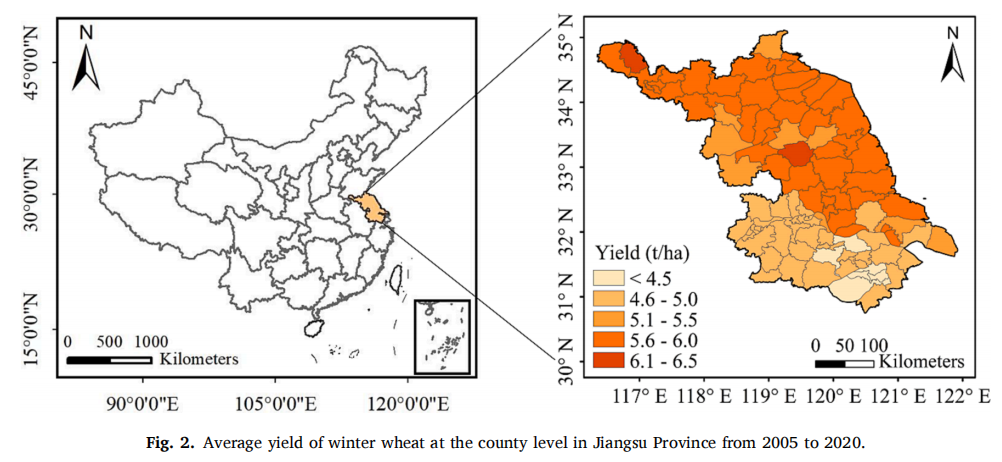 准确和及时地预测产量和确定其驱动因素对于调整农业干预措施,应对气候变化和确保粮食安全至关重要。中国是世界上最大的小麦生产国,小麦产量占全国粮食总产量的30%,其中冬小麦约占95%。中国冬小麦的安全生产关乎国家粮食安全和世界粮食贸易。江苏省位于长江中下游平原,是我国冬小麦主产省之一,具有雨热同期的适宜气候和平坦开阔的地理条件,为冬小麦生产提供了得天独厚的种植环境。