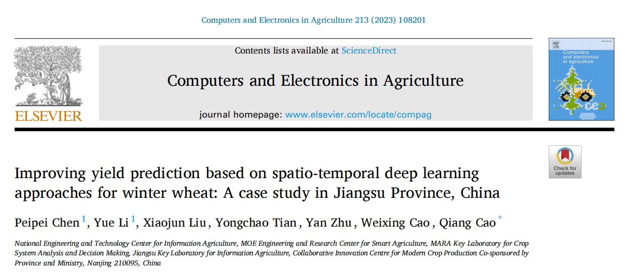 近日,DB彩票 种子科学与工程专业192班陈沛沛同学以共同第一作者在农林科学领域TOP期刊《Computers and Electronics in Agriculture》发表了题为“Improving yield prediction based on spatio-temporal deep learning approaches for winter wheat: A case study in Jiangsu Province, China ”的研究论文,该文以江苏省为研究区开展了基于时空深度学习算法的县域尺度冬小麦产量预测研究。