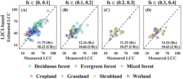 不同土壤覆盖度条件下应用3SV算法前后LCC估算性能比较:(A)0-0.1、(B)0.1-0.2、