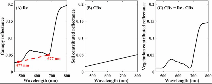 (Rc和CRv分别代表原始冠层和消除土壤信号后的植被组分光谱)