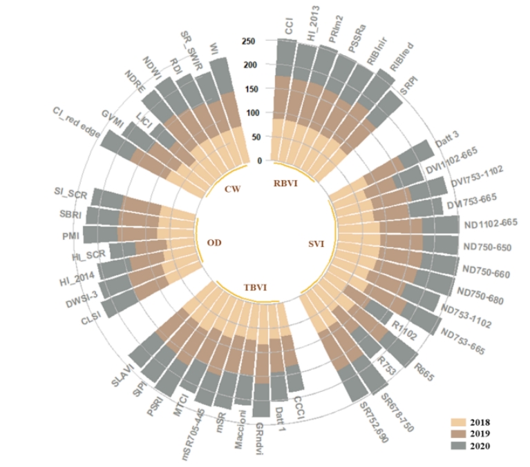 图2. RIBIs与传统光谱植被指数在温室(2018和2019)和自然条件下(2020)对健康与感病叶片分类精度的比较。RBVI:前人研究中对稻叶瘟较敏感的植被指数,SVI:类似RIBI的植被指数,TBVI:传统三波段植被指数,OD:其他类型病害指数,CW:叶绿素及水分敏感植被指数。