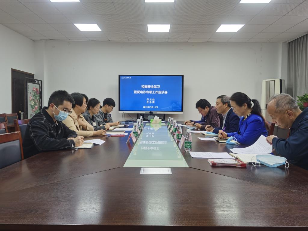 5月13日下午2:30,“校园安全保卫暨反电诈专项工作交流座谈会”在生科楼B1013召开。DB彩票 保卫处副处长何东方、综合政保科班宏、凌至路,消防安全科毛书照、校园秩序管理科黄海,DB彩票 党委副书记殷美,辅导员许娜、陈杰、高强,到场参与。