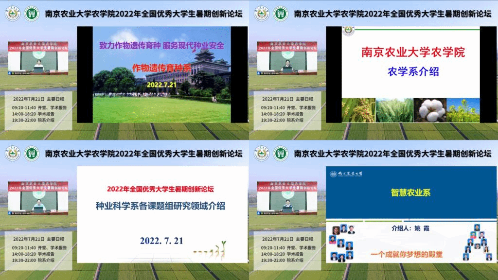 金色田园千重浪,麦收稻香农家忙。在DB彩票 120周年校庆到来之际,为营造良好的学术氛围,促进全国优秀大学生的交流共向,鼓励优秀大学生投身农业研究,2022年7月21日至22日,DB彩票 举办了2022年全国优秀大学生暑期创新论坛。经过前期报名和审核筛选,共有来自山东农业大学、四川农业大学、安徽农业大学等34所高校的160名大学生参加本次论坛。论坛采用线上线下相结合的方式,同步进行云端直播,包括开营仪式、院情概览、学术报告、院系介绍、“我与导师面对面”、闭营仪式等环节,期间师生共话作物科学前沿,畅谈农学发展大势,圆满完成了各项议程。