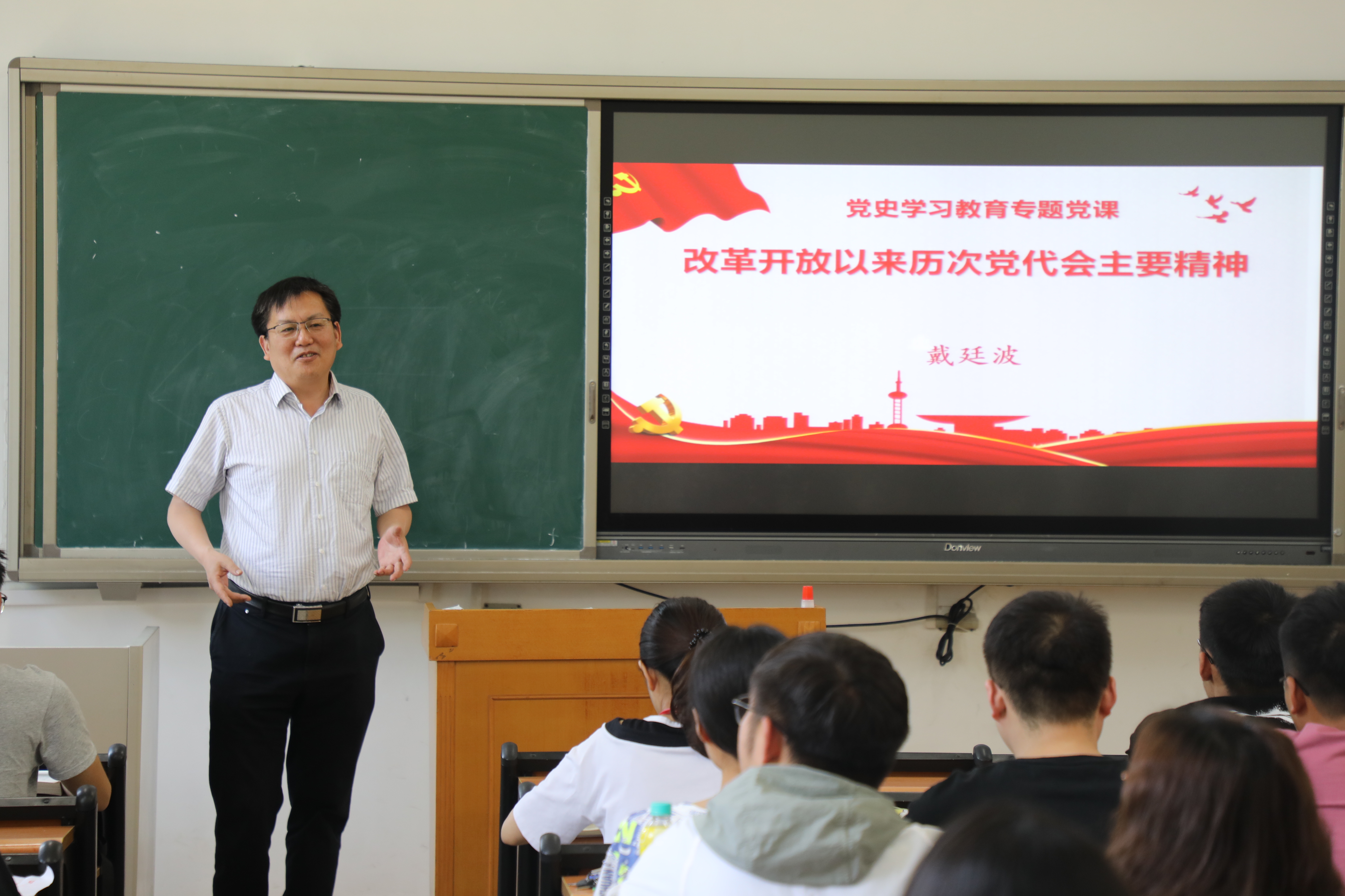 2021年6月23日下午,DB彩票 党委书记戴廷波在教学楼A102教室以《改革开放以来历次党代会主要精神》为主题讲授专题党课。DB彩票 新发展的学生党员及部分教师党员聆听了此次党课。