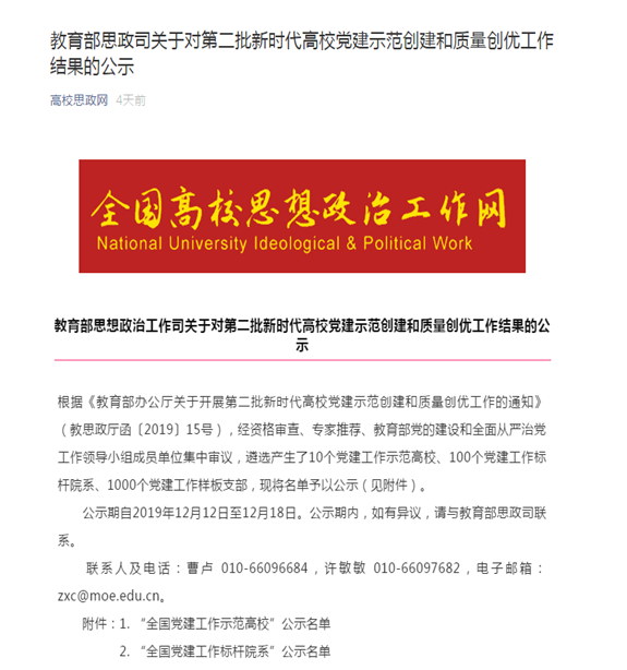 思想政治理论课教师座谈会精神,结合“不忘初心、牢记使命”主题教育,面向全国高校培育创建10所党建工作示范高校、100个党建工作标杆院系、1000个党建工作样板支部。根据《教育部办公厅关于开展第二批新时代高校党建示范创建和质量创优工作的通知》(教思政厅函〔2019〕15号),经资格审查、专家推荐、教育部党的建设和全面从严治党工作领导小组成员单位集中审议,DB彩票