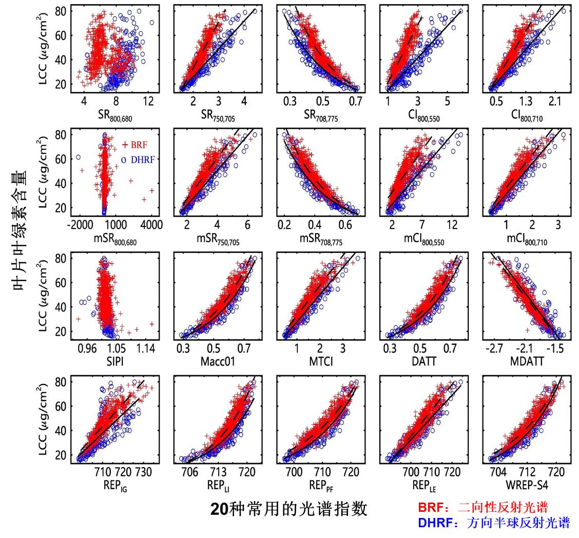 叶绿素含量是反映作物光合能力与氮素营养状况的重要指标。如何利用作物反射光谱准确无损监测叶片叶绿素含量(µg/cm2),一直是国际农情遥感监测领域的研究热点。叶片反射光谱主要有积分球测量的方向半球反射率和叶片夹测量的二向性反射率两类。前者在理论研究中应用较多,后者是近几年发展起来的实用型高效测量方法。然而,两类反射光谱到底存在何种差异,以及由此构建的叶绿素估算模型是否可相互移植,一直鲜有报道。该研究在解析两类叶片光谱的特征差异及形成机理后,定量评估了叶片镜面反射效应对叶片叶绿素含量监测的影响,首次系统解析了不同类型光谱指数对叶片镜面反射的敏感性,明确了可以消除镜面反射影响的光谱指数类型,从而提出了适用于不同类型反射光谱的叶绿素含量统一估算模型,应用统一模型的估算精度最高达到94%(估算误差为3.5µg/cm2)。该研究为基于不同类型光谱的叶绿素监测提供了参考依据,对于作物叶片叶绿素含量的高通量智能化监测具有重要的应用价值。
