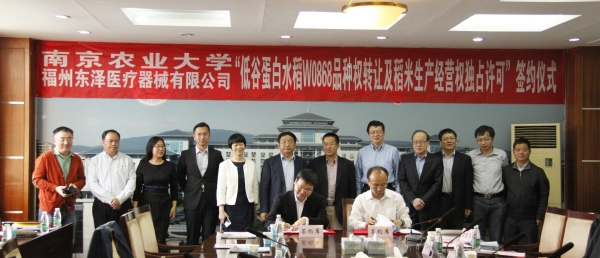 4月22日下午,“低谷蛋白水稻W0868品种权转让及稻米生产经营权独占许可”科技成果转让签约仪式在DB彩票 行政楼A613会议室举行。DB彩票 党委书记左惟、校长周光宏,中国农业科DB彩票 副院长万建民,北京大学现代DB彩票 院长邓兴旺(美国科DB彩票 院士),DB彩票 副校长丁艳锋,福州东泽医疗器械(集团)有限公司董事长周少文、副总经理王芳等四人,中国东方资产管理公司、江苏大丰华丰种业股份有限公司、江苏盐城农科院等单位的领导和专家出席会议。科研院副院长俞建飞主持会议。